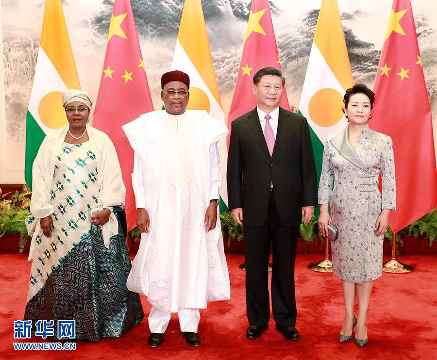 5月28日,國家主席習(xí)近平在北京人民大會堂同尼日爾總統(tǒng)伊素福舉行會談。這是習(xí)近平和夫人彭麗媛同伊素福夫婦合影。 新華社記者 龐興雷 攝