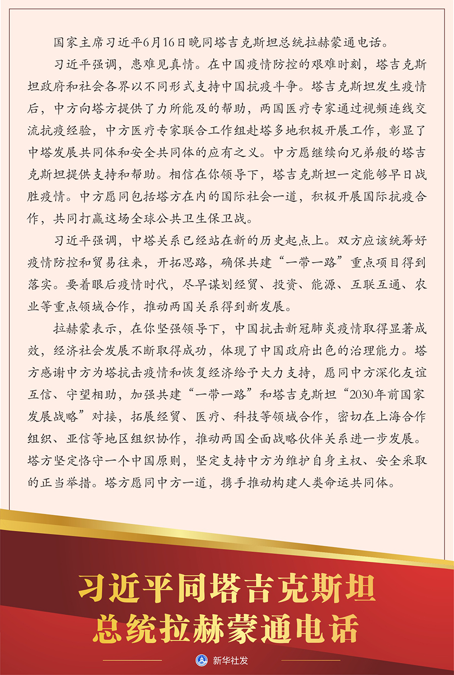 新華社北京6月16日電 國(guó)家主席習(xí)近平6月16日晚同塔吉克斯坦總統(tǒng)拉赫蒙通電話(huà)。