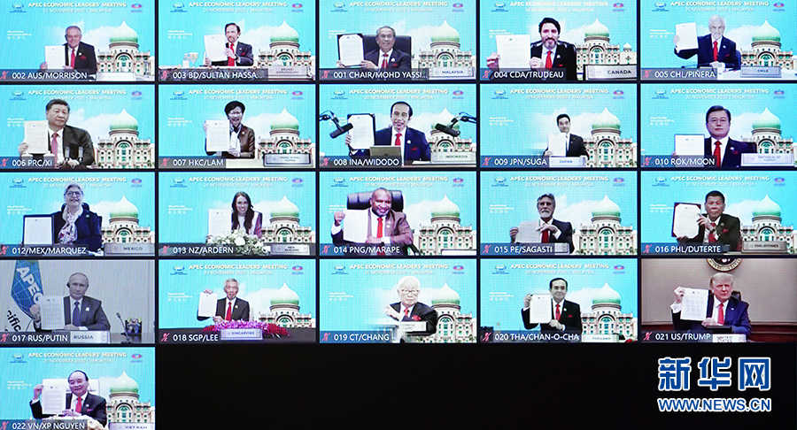 11月20日晚,國家主席習近平在北京以視頻方式出席亞太經(jīng)合組織第二十七次領導人非正式會議并發(fā)表重要講話。這是與會各經(jīng)濟體領導人、代表通過《2040年亞太經(jīng)合組織布特拉加亞愿景》并線上合影。 新華社記者 李響 攝