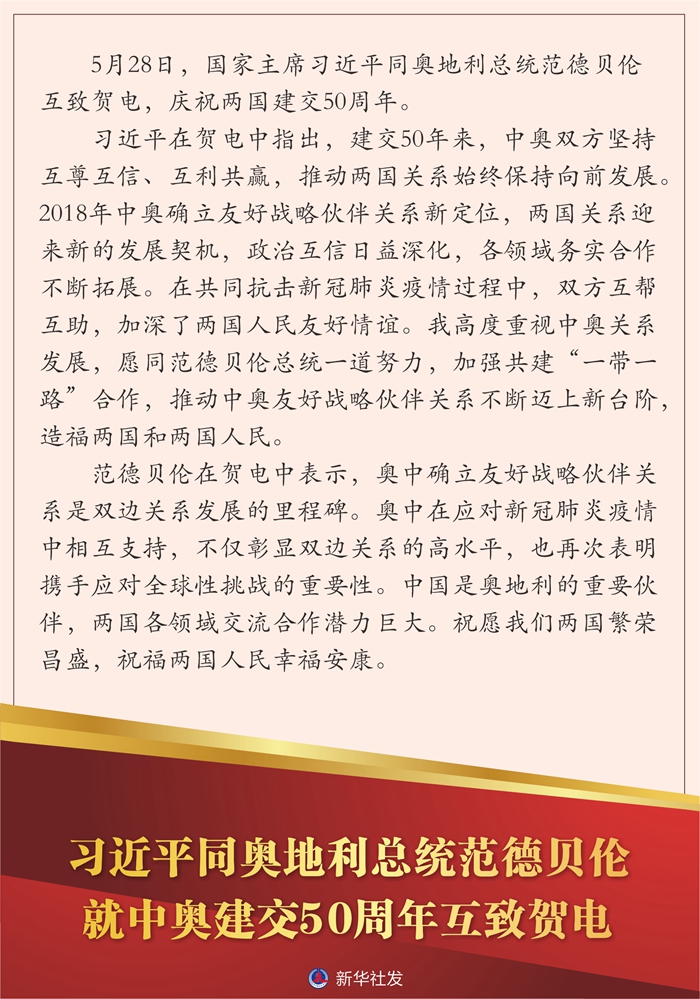 新華社北京5月28日電 5月28日,國家主席習(xí)近平同奧地利總統(tǒng)范德貝倫互致賀電,慶祝兩國建交50周年。