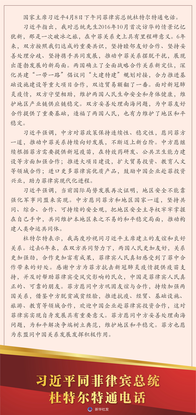 新華社北京4月8日電 國(guó)家主席習(xí)近平4月8日下午同菲律賓總統(tǒng)杜特爾特通電話。