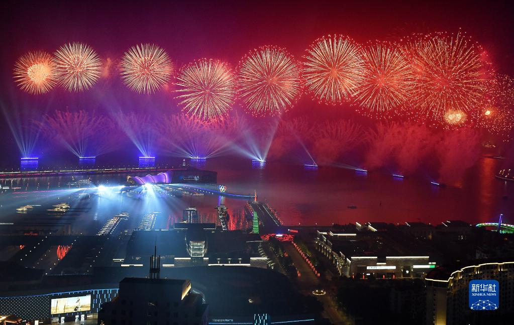 這是2018年6月9日晚在青島舉行的《有朋自遠(yuǎn)方來》燈光焰火藝術(shù)表演。2018年6月9日至10日,上海合作組織成員國元首理事會(huì)第十八次會(huì)議在青島召開。新華社記者 李紫恒 攝