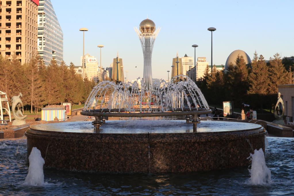 哈薩克斯坦首都努爾蘇丹的噴泉和遠(yuǎn)處的巴伊杰列克觀景塔。新華社記者 魯金博 攝