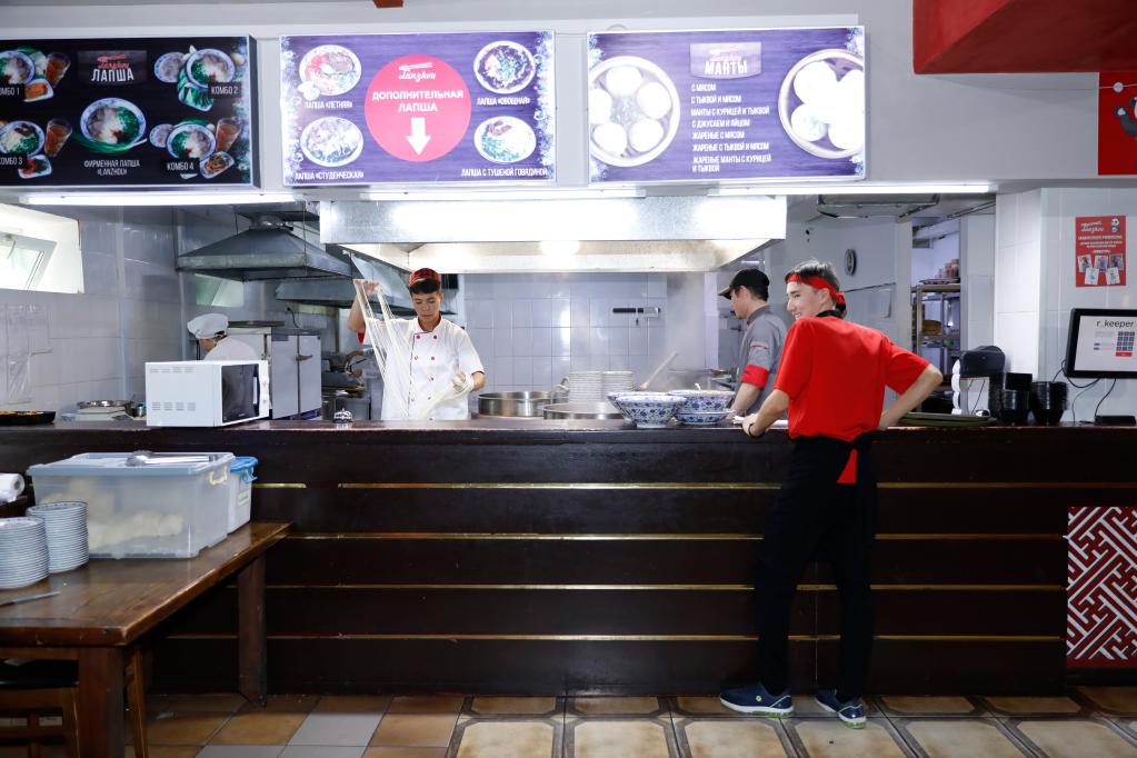 哈薩克斯坦首都努爾蘇丹,在當(dāng)?shù)厝碎_辦經(jīng)營(yíng)的中國(guó)蘭州拉面風(fēng)味連鎖餐館“Lanzhou”,廚師正在抻拉面條。新華社發(fā)