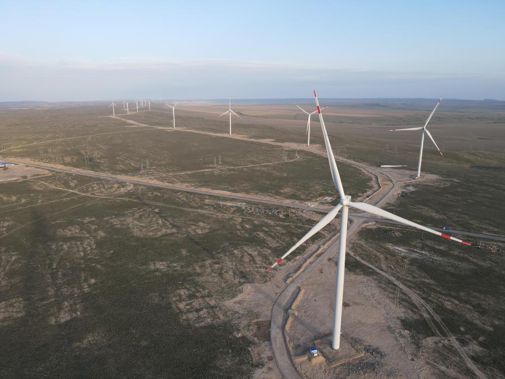 2021年4月25日在哈薩克斯坦扎納塔斯用無(wú)人機(jī)航拍的風(fēng)電場(chǎng)的風(fēng)機(jī)。新華社發(fā)(中國(guó)電建成都院供圖)
