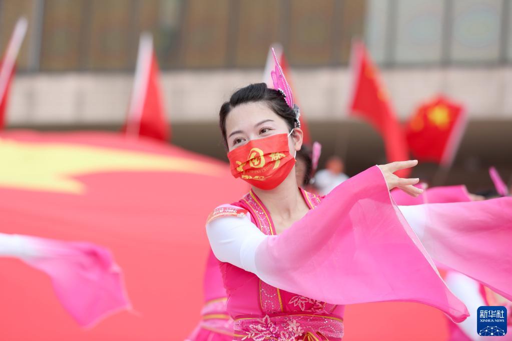 “我和我的祖國,一刻也不能分割。”當(dāng)《我和我的祖國》的悠揚(yáng)樂聲響起,盛裝的舞蹈演員邁出歡快的步伐;數(shù)百名市民放聲高歌,手中揮動的五星紅旗與巨幅國旗交相輝映,廣場融匯成歡騰的紅色海洋。