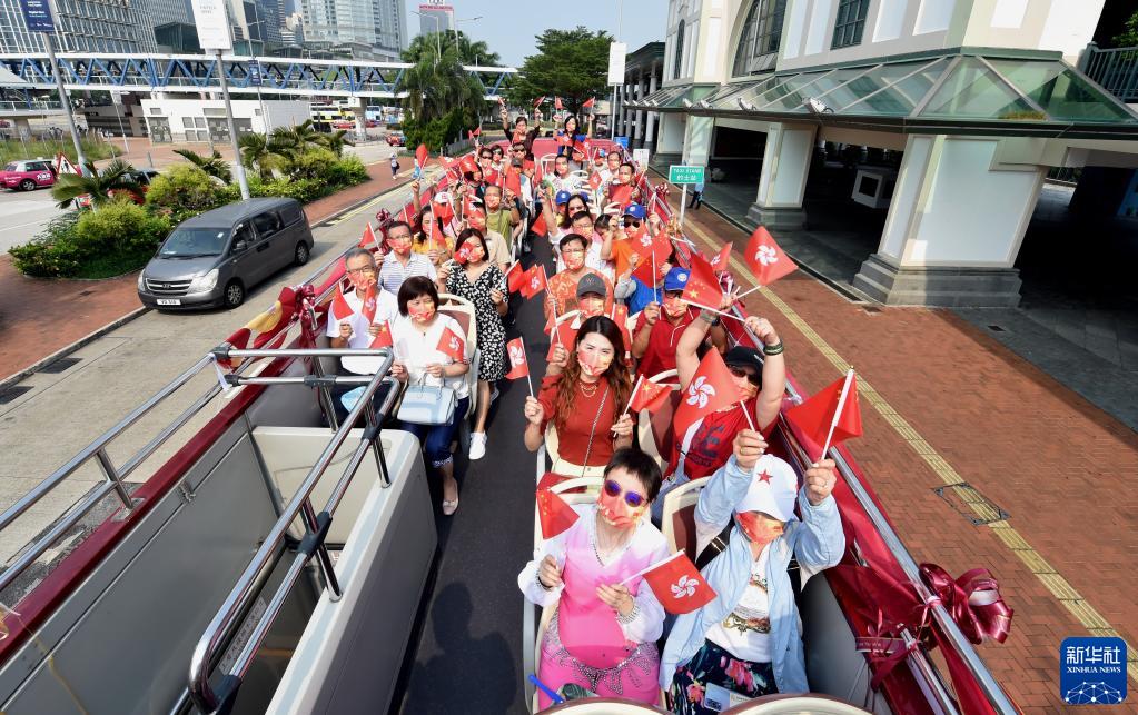 10月1日,在香港街頭,參加慶祝國慶巴士巡游的人們揮動國旗和香港特區(qū)區(qū)旗。新華社記者 盧炳輝 攝 |