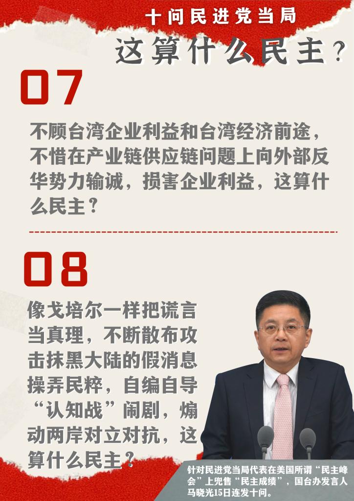 為勾結(jié)、貼靠境外反華勢力謀“獨”,不惜損害臺灣同胞利益,甚至以島內(nèi)民眾健康福祉為代價,“盡臺灣之物力,結(jié)外國之歡心”,這算什么民主?