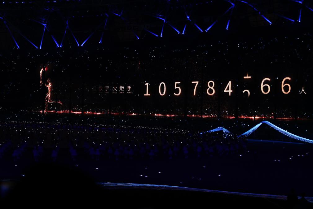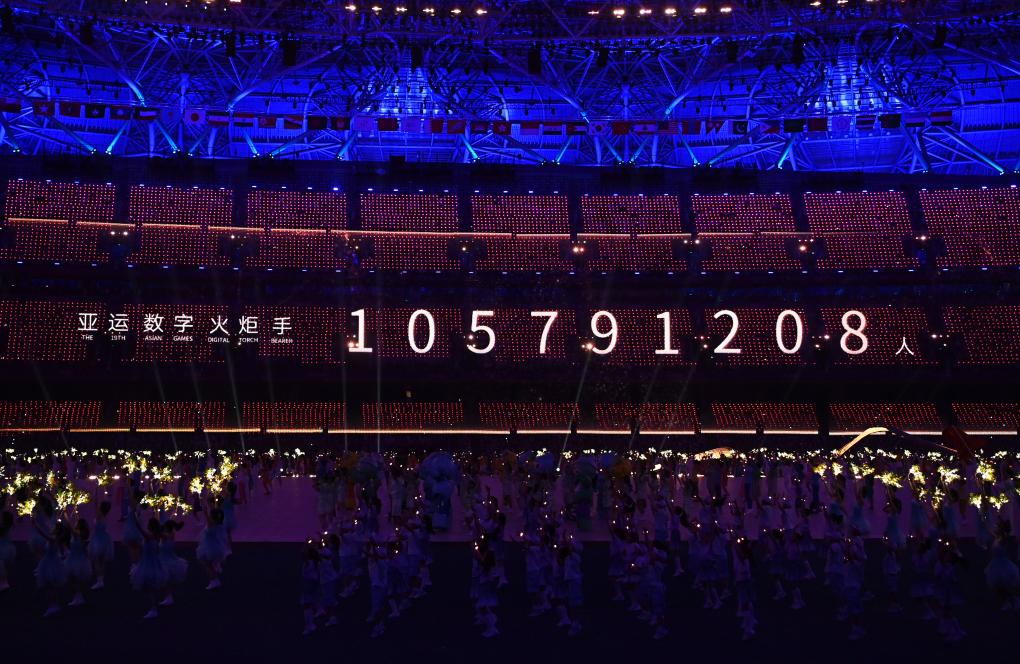 這是9月23日拍攝的開(kāi)幕式現(xiàn)場(chǎng)顯示的亞運(yùn)數(shù)字火炬手人數(shù)。新華社記者黃宗治攝