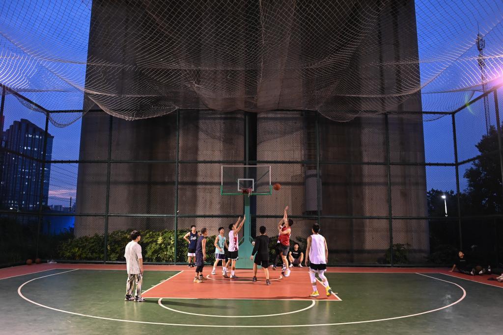 2022年9月20日,市民在位于高鐵橋下的錢江世紀(jì)城體育公園打籃球。新華社記者黃宗治攝