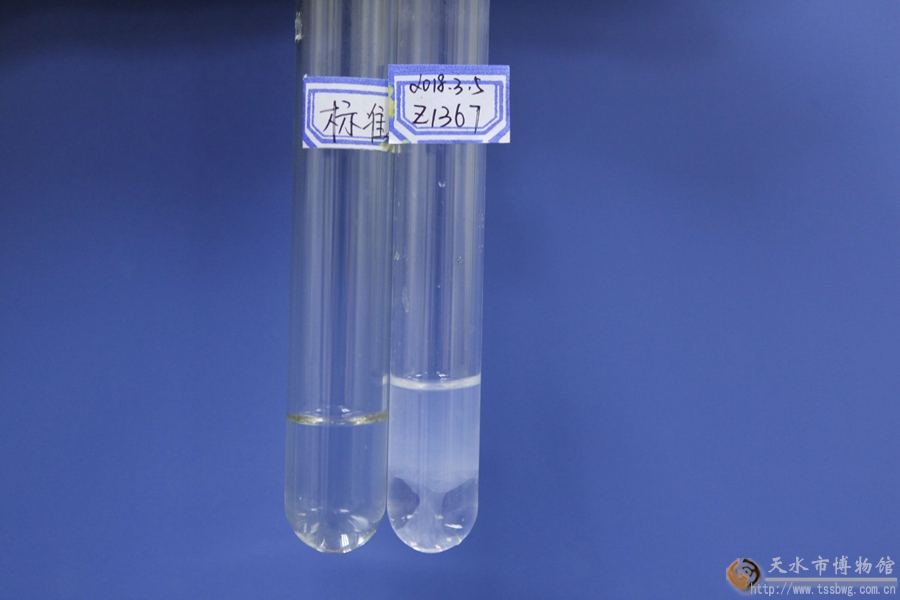 為了防止器物間病害相互傳染,便于觀察記錄每件器物的浸泡效果,我們采用密封盒將每件器物單獨(dú)浸泡。換溶液之前提取浸泡后的溶液做硝酸銀滴定實(shí)驗(yàn),檢測(cè)氯離子濃度,并對(duì)實(shí)驗(yàn)結(jié)果進(jìn)行拍照記錄。