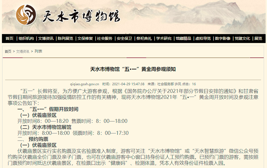 4月29日,市博物館官網(wǎng)發(fā)布《天水市博物館“五·一”黃金周參觀須知》,詳細(xì)公布了開放時間、預(yù)約購票辦法、防疫要求、交通線路和注意事項等。4月25日,市博物館官網(wǎng)轉(zhuǎn)發(fā)了《天水市文化和旅游局“五一”假期 旅游安全溫馨提示》,對游客選擇參加旅游團(tuán),簽訂合同等進(jìn)行了溫馨提示。