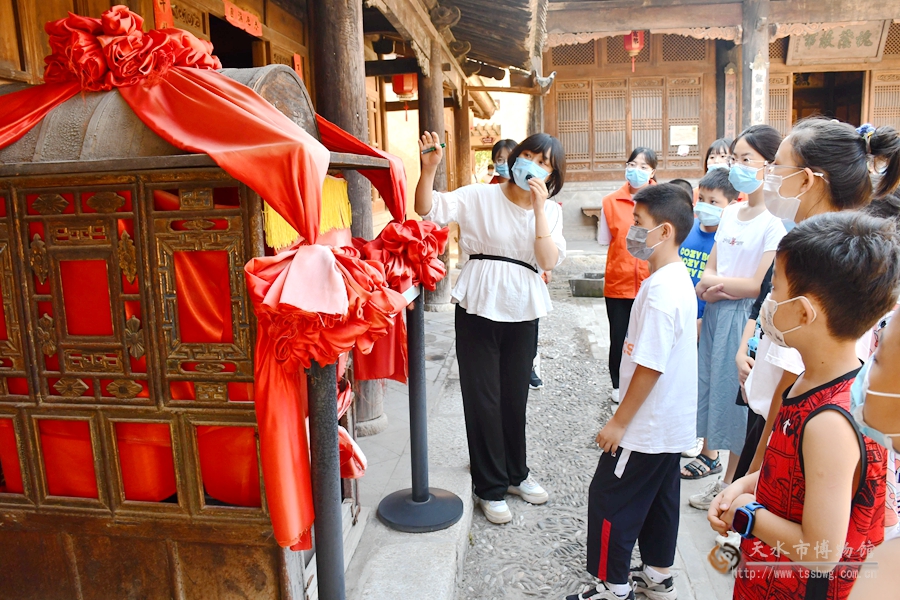 花轎,在古代作為人們出行的主要交通工具,為人們生活帶來便利的同時,也極大地影響和改變了我們的生活。現(xiàn)如今,隨著人類社會的快速發(fā)展,傳統(tǒng)的花轎早已退出了我們的生活,但它卻成為人們生活中美好的回憶。為了全面保護和傳承優(yōu)秀傳統(tǒng)文化,讓大家了解有關(guān)花轎及嫁娶的相關(guān)知識,感受傳統(tǒng)文化的魅力,激發(fā)傳承中華優(yōu)秀傳統(tǒng)文化的信心,天水民俗博物館在8月1日邀請了30位小朋友以及來自蘭州大學(xué)、天水師范學(xué)院的15位大學(xué)生,開展了“花轎,重拾歷史的印記”社教活動。