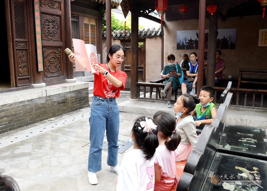 整場活動按照三個步驟有序推進:首先引領(lǐng)同學(xué)們參觀胡氏民居古建筑群,一睹明清時期天水古民居建筑的藝術(shù)風(fēng)光;重點對展室陳列的漆器和一些剪紙作品進行了詳細介紹,加深孩子們的印象。