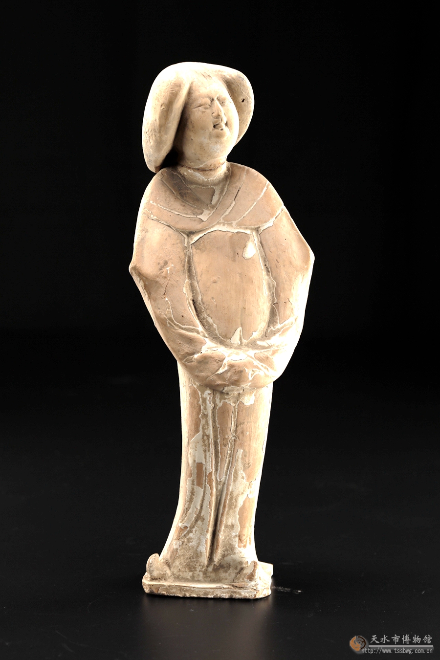 天水市博物館藏的一件唐代仕女俑,寬4.5厘米,高28厘米,1976年在天水市秦城區(qū)北山皇城采集。這件仕女俑泥質紅陶,女俑頭梳雙髻,上著交領窄袖襦裙,鞋頭上翹,雙手拱貼于腹部藏于袖中,抬頭作站立觀望狀。女俑面頰圓潤飽滿,彎彎的眉毛,細長的眼睛,整體造型簡潔大方,體態(tài)豐腴,儀表嫻雅。