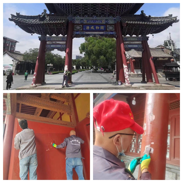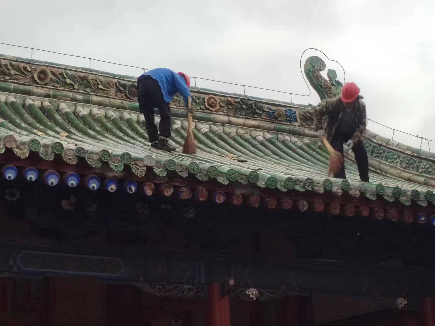2023年公祭伏羲大典即將來臨,為營造一個整潔、莊重的祭祀氛圍,今年5月初,天水市博物館組織專業(yè)人員對伏羲廟內外區(qū)域進行了全面的環(huán)境綜合治理。此次環(huán)境治理主要對伏羲廟古建筑的屋面進行除草、清掃,對大木構架、彩繪面進行除塵,對廟內外破損的檐柱、紅墻進行修補。