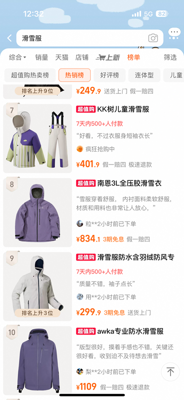 天貓“雙旦”禮遇季期間,國產(chǎn)品牌ISEE MIGGA成交同比增長超500%,awka 3L滑雪服單日賣2000多件。在天貓滑雪服銷量榜(截至2024年12月31日)前10名中,7個均為國產(chǎn)品牌。