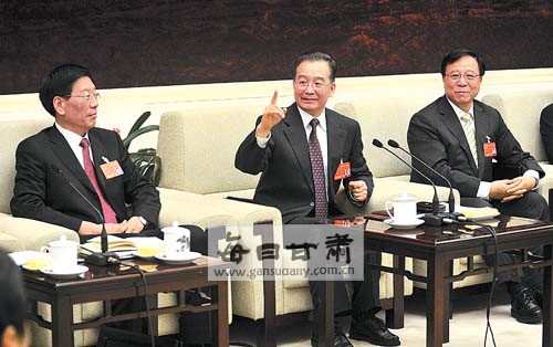 上午9時(shí)整,中共中央政治局常委、國(guó)務(wù)院總理溫家寶面帶笑容,準(zhǔn)時(shí)走進(jìn)會(huì)場(chǎng),與代表們握手致意,同他所在的十一屆全國(guó)人大一次會(huì)議甘肅代表團(tuán)的代表一起審議政府工作報(bào)告。