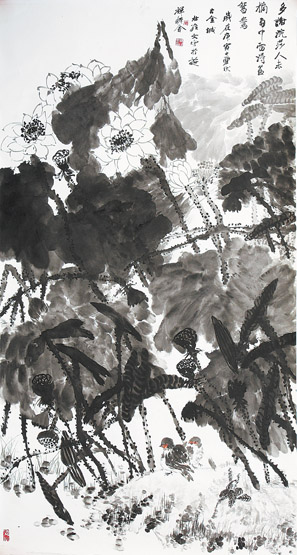 多謝浣紗人未摘雨中留得蓋鴛鴦(國畫) 林經(jīng)文