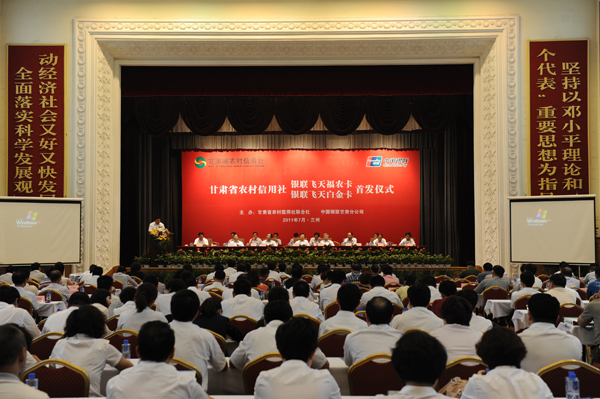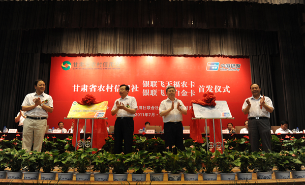 (省政協(xié)主席馮健身,省委常委、常務副省長劉永富,省政協(xié)副主席張世珍,省委副秘書長、辦公廳主任陳田貴等領導為“飛天福農卡”、“飛天白金卡”揭卡。配圖:天水在線)