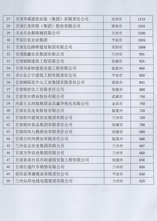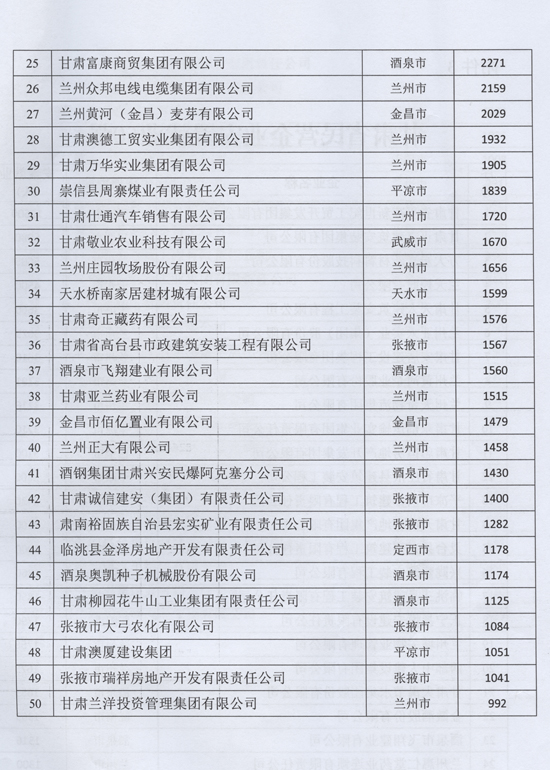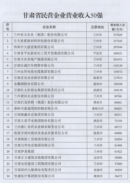 據(jù)悉,甘肅省工商聯(lián)從2014年6月開始,組織各市州工商聯(lián)、直屬商會對全省2013年度營業(yè)收入1000萬元以上的民營企業(yè)進行了調(diào)研,以民營企業(yè)自愿參加、企業(yè)法人親筆簽字并加蓋企業(yè)公章、有關(guān)職能部門審核的原則,共收錄符合條件的294戶民營企業(yè)的經(jīng)營情況、繳納稅金、資產(chǎn)和人員規(guī)模、企業(yè)管理和技術(shù)創(chuàng)新等內(nèi)容,對收集到的各類數(shù)據(jù)進行了認真細致、科學量化分析,評選出甘肅省2013年度民營企業(yè)營業(yè)收入50強、稅收50強和安置就業(yè)50強。