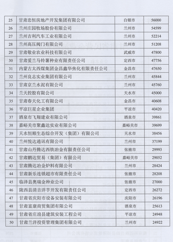 蘭州亞太實業(yè)集團以35.76億元、方大碳素公司以33.73億元和西部中大建設(shè)集團以29.78億元分別列前三位。