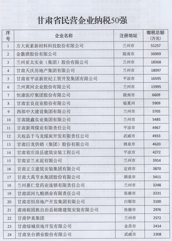 在民營企業(yè)納稅50強中,蘭州占36%、張掖、酒泉各占14%、平?jīng)稣?0%。房地產(chǎn)業(yè)占16%、房屋建筑業(yè)占12%、酒類企業(yè)占10%。