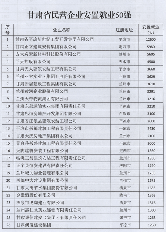 甘肅平?jīng)鲂率兰o工貿(mào)集團、甘肅正立建筑安裝集團、方大炭素公司分別以安置就業(yè)12600人、5980人和5605人分列前三位。
