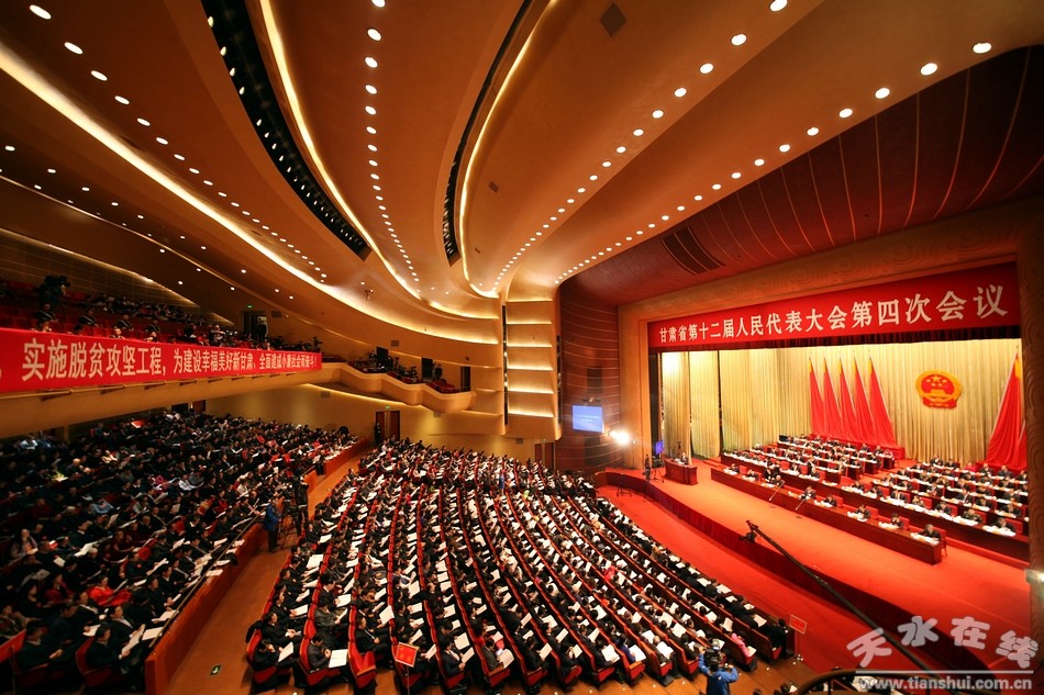 甘肅大劇院氣氛莊嚴(yán)熱烈,巨大的國徽懸掛在主席臺帷幕中央,熠熠生輝;會場中“堅(jiān)定信心、凝聚力量,實(shí)施脫貧攻堅(jiān)工程,為建設(shè)幸福美好新甘肅、全面建成小康社會而奮斗!”的大幅標(biāo)語鼓舞人心、催人奮進(jìn)。