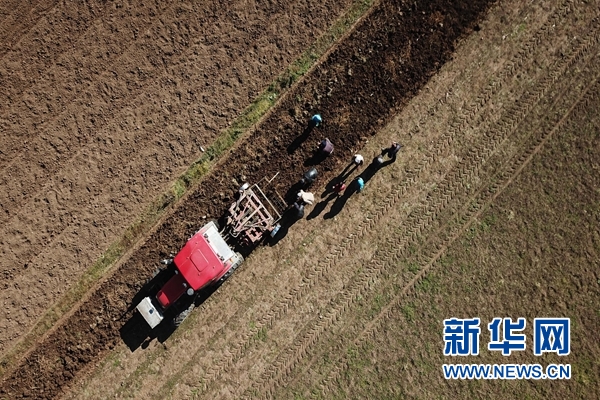 在甘肅省定西市渭源縣蓮峰鎮(zhèn)何家灣村,藥農(nóng)進行機械化采藥作業(yè)(無人機拍攝)。新華社記者 陳斌 攝(資料圖片)