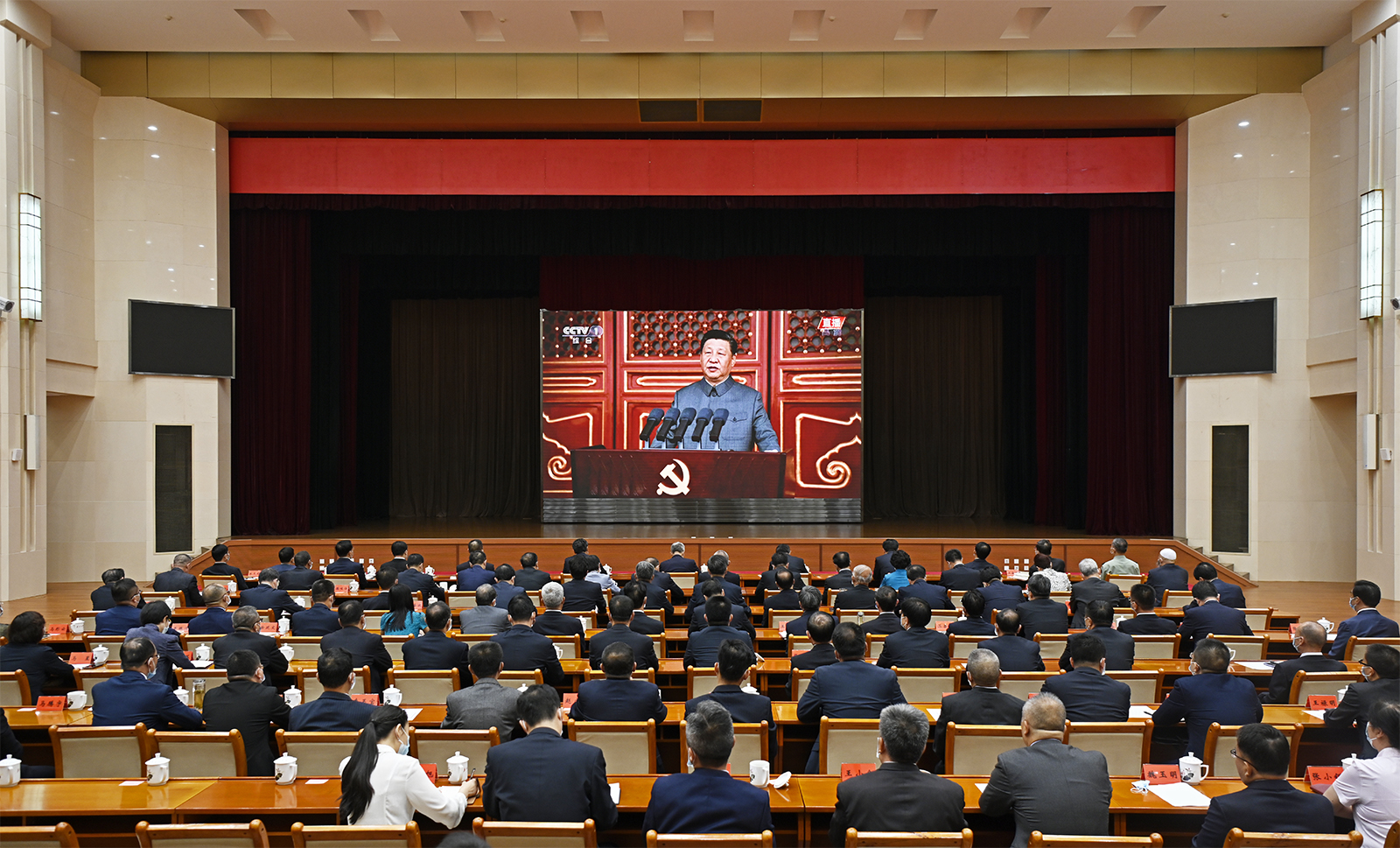 7時(shí)53分許,在歡快的樂曲聲中,習(xí)近平等黨和國家領(lǐng)導(dǎo)人來到天安門城樓主席臺(tái),會(huì)場(chǎng)爆發(fā)出熱烈的掌聲。8時(shí)整,慶祝大會(huì)開始,中國人民解放軍聯(lián)合軍樂團(tuán)奏響雄壯的《義勇軍進(jìn)行曲》,尹弘、任振鶴等全體起立,隨北京現(xiàn)場(chǎng)一起高唱中華人民共和國國歌,目視大屏幕里鮮艷奪目的五星紅旗冉冉升起,在天安門廣場(chǎng)上空迎風(fēng)飄揚(yáng)。在熱烈的掌聲中,習(xí)近平總書記發(fā)表重要講話,大家認(rèn)真聆聽、專心筆記,第一時(shí)間深刻學(xué)習(xí)領(lǐng)會(huì),不時(shí)報(bào)以熱烈的掌聲。