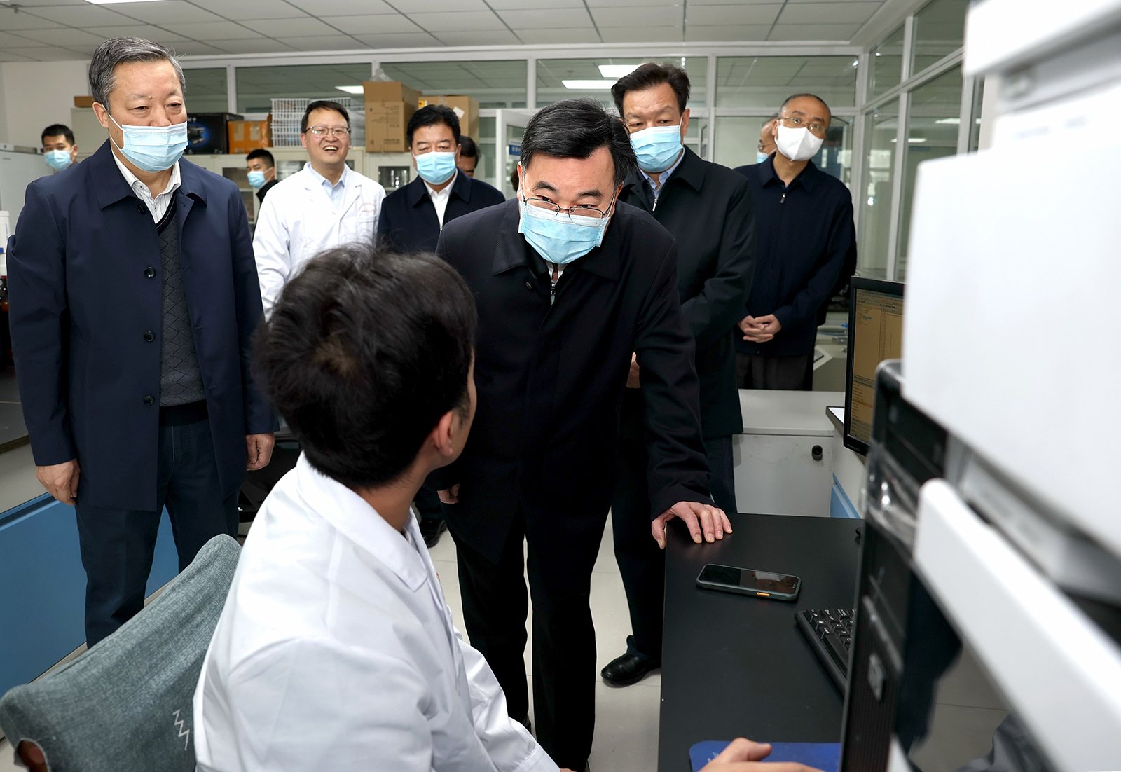 胡昌升實地調(diào)研了解了高級別生物安全實驗室、動物疫病防控全國重點實驗室和農(nóng)業(yè)農(nóng)村部獸藥創(chuàng)制重點實驗室建設,以及科技研發(fā)、成果轉(zhuǎn)化、產(chǎn)業(yè)化應用、新品研制、人才培養(yǎng)等情況,對兩家研究所取得的成績給予充分肯定,對服務和支持甘肅發(fā)展作出的貢獻表示感謝。