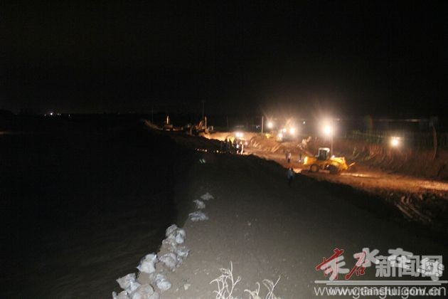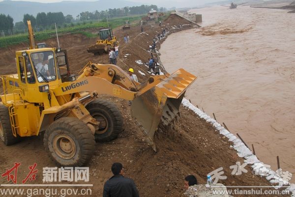 大雨停了,可是新的險情又出現(xiàn)了。受渭河上游降水等因素的影響,渭河水位不斷上漲,7月25日上午,湍急的河水造成甘谷縣新興鎮(zhèn)十甲村河段、六峰鎮(zhèn)石灘村河段、二十鋪雞咀河段、磐安鎮(zhèn)河段等多處發(fā)生了近千米的兌岸險情,甘谷縣水務局對這一險段采取了緊急度汛措施,迅速調集了2000條麻袋、1.8萬條編織袋、10萬立方米砂石料、0.32萬立方米塊石、0.5噸鉛絲、1340片鉛絲網片和26立方樁木等搶險物資,共計54.32萬元,組織起1000多人的搶險隊伍,于25日下午1點展開了對新興鎮(zhèn)十甲村河段、六峰鎮(zhèn)石灘村河段、二十鋪雞咀河段、磐安鎮(zhèn)河段的除險加固工作。此次加固工程主要采取沙袋護岸和石籠邊載的措施。由于渭河上游仍在降雨,河水不斷上漲,險段處河水最深達到5米左右,給險段加固工作帶來了很大難度。為此,緊急調用了80多輛裝載機、挖掘機、卡車和三輪車,1000多名搶險隊員也按照任務分組,分成不同的班次,輪番上陣;縣水務局黨委書記、局長董德福現(xiàn)場指揮搶險救災工作,和各支部黨員同志始終堅持在搶險一線,既當指揮員又當戰(zhàn)斗員。盡管持續(xù)上漲的河水造成搶險道路非常泥濘,但全體指戰(zhàn)員絲毫沒有懈怠,踩著泥濘的道路連續(xù)奮戰(zhàn)了七天七夜。由于整個搶險工作措施得當,截至目前,新興鎮(zhèn)十甲村河段、六峰鎮(zhèn)石灘村河段、二十鋪雞咀河段、磐安鎮(zhèn)河段的除險加固工作勝利完成,實現(xiàn)了此次抗洪搶險過程中零傷亡。同時董德福一行布置渭河沿岸鄉(xiāng)鎮(zhèn),進行24小時巡堤,以確保洪峰順利通過,大堤安全無恙。