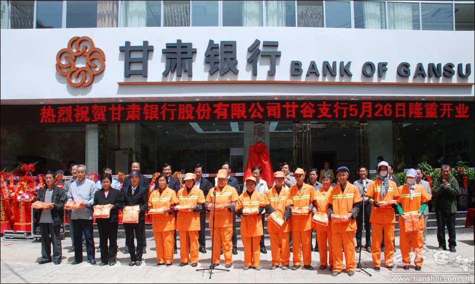 5月26日,甘肅銀行甘谷支行掛牌開業(yè)。天水市政府副秘書長(zhǎng)楊帆,甘谷縣人大常委會(huì)主任令建民,縣委常委、常務(wù)副縣長(zhǎng)孟小龍,縣委常委、統(tǒng)戰(zhàn)部部長(zhǎng)張發(fā)茂、副縣長(zhǎng)牛武軍,縣政協(xié)副主席王金生,天水市政府金融辦副主任趙劍孝,天水市銀監(jiān)分局副局長(zhǎng)佟旭東,天水市人民銀行副行長(zhǎng)鞏守效等參加揭牌儀式。
