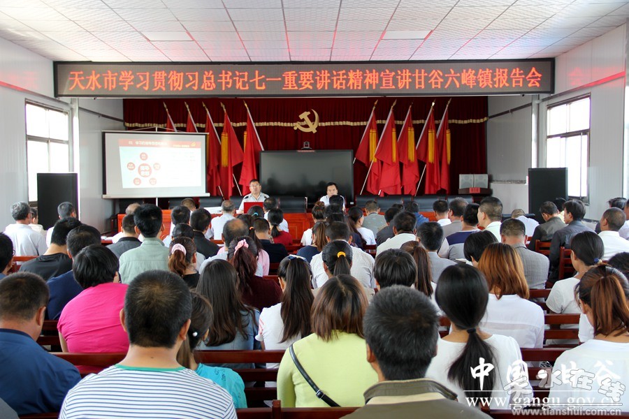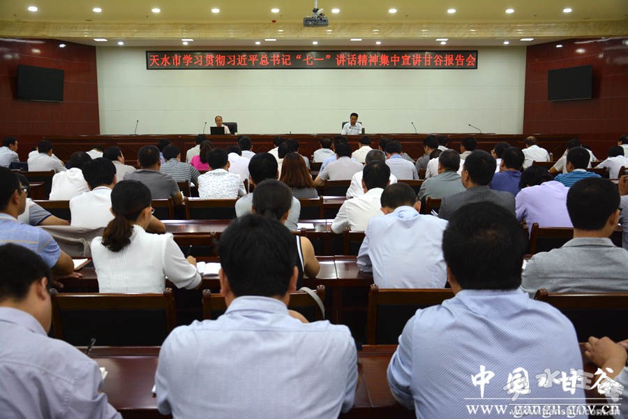 9月1日,天水市委講師團(tuán)團(tuán)長(zhǎng)郭黎平帶領(lǐng)宣講團(tuán)深入甘谷宣講習(xí)近平總書(shū)記“七一”重要講話精神?h四大組織在家領(lǐng)導(dǎo),各鄉(xiāng)鎮(zhèn)、各部門(mén)、各單位科級(jí)以上領(lǐng)導(dǎo)干部共計(jì)320多人在主會(huì)場(chǎng)聆聽(tīng)了輔導(dǎo)報(bào)告?h委常委、宣傳部長(zhǎng)張慶元主持報(bào)告會(huì)。