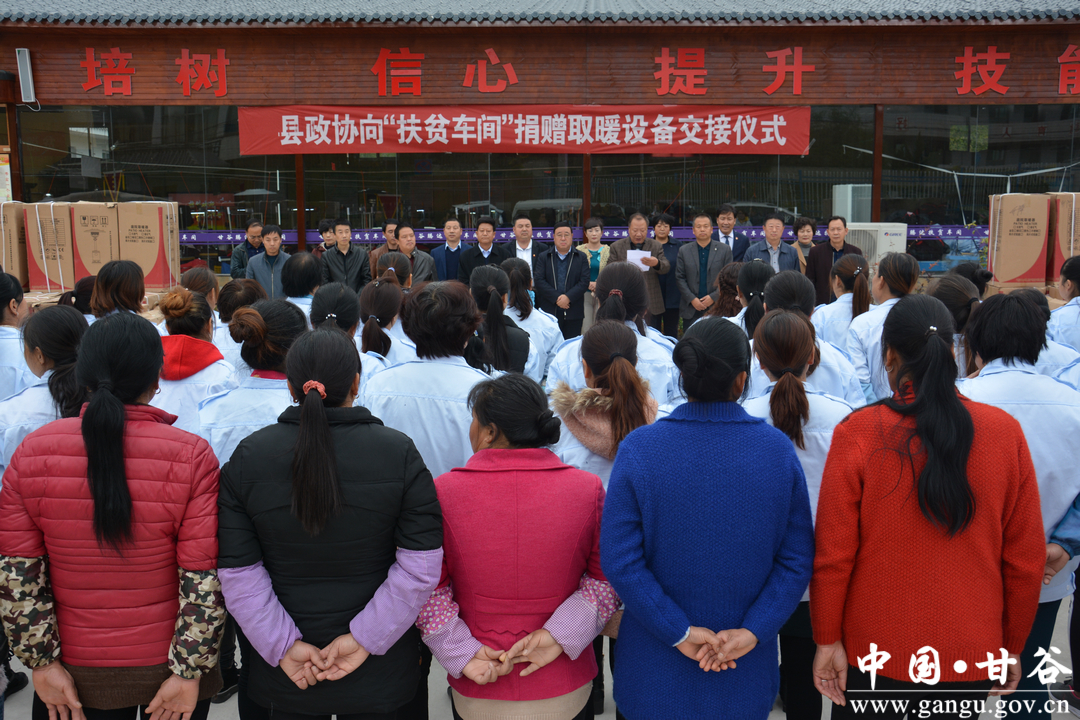 10月24日,甘谷縣政協(xié)向“扶貧車間”捐贈(zèng)取暖設(shè)備交接儀式在六峰鎮(zhèn)“扶貧車間”舉行?h政協(xié)主席馬驥出席交接儀式并講話;縣政協(xié)副主席董成斌向人社局負(fù)責(zé)人移交了取暖設(shè)備,縣政協(xié)副主席郭長(zhǎng)勝主持交接儀式;縣直有關(guān)部門負(fù)責(zé)人、部分政協(xié)民營(yíng)企業(yè)家委員及六峰鎮(zhèn)“扶貧車間”工作人員參加交接儀式。