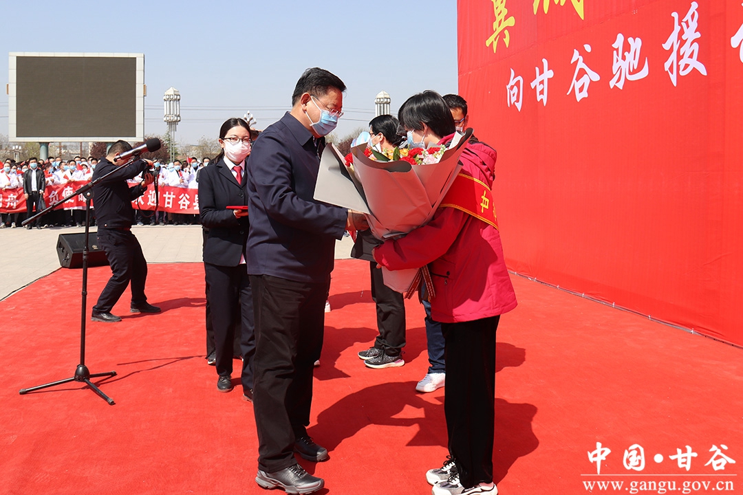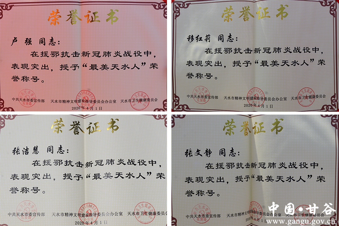 (市委常委、宣傳部部長(zhǎng)張建杰為醫(yī)療隊(duì)員頒發(fā)“最美天水人”榮譽(yù)證書)