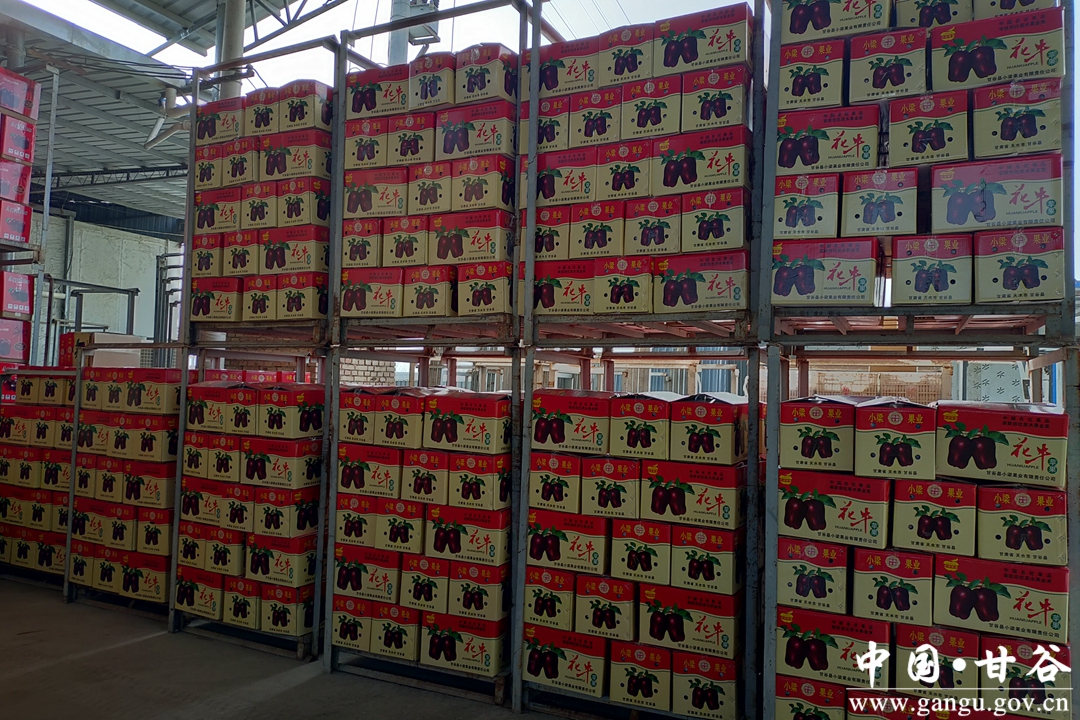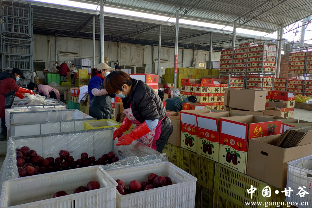 蘋果分級(jí)、套袋、裝箱、裝車……在甘谷興業(yè)冷庫(kù)車間內(nèi),工人正在忙著將冷庫(kù)貯存的新鮮蘋果包裝發(fā)貨。