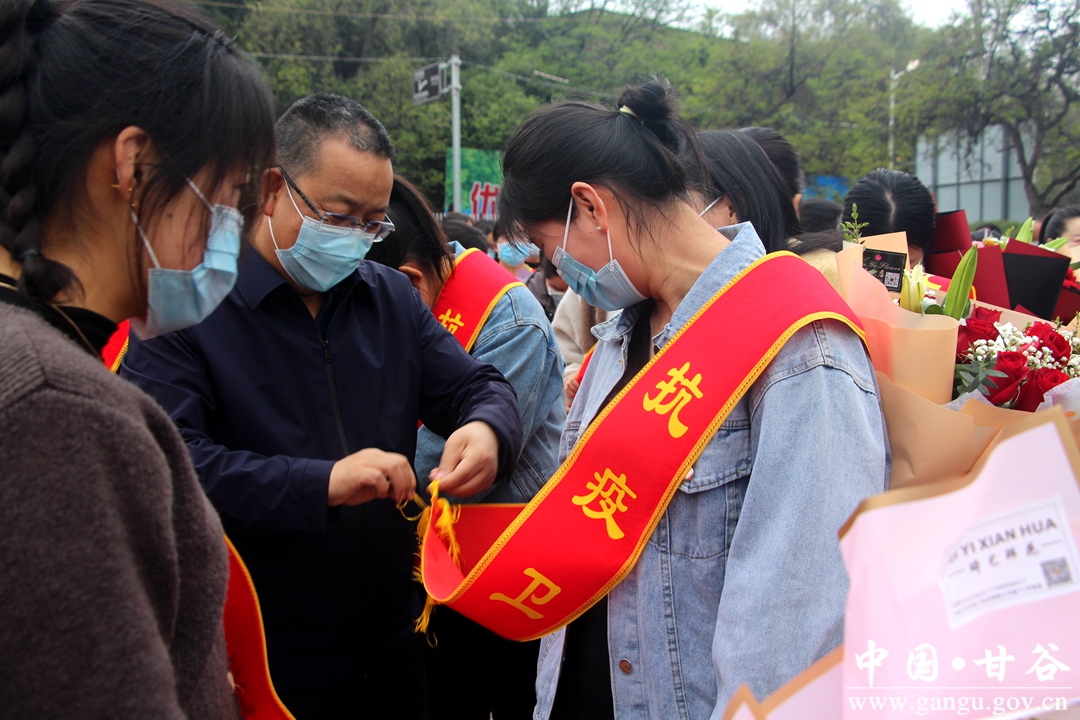 4月14日上午,甘谷縣100名支援天水核酸采樣的醫(yī)護(hù)人員在圓滿完成任務(wù)后順利返回甘谷,副縣長劉強(qiáng)和縣衛(wèi)健局負(fù)責(zé)人迎接醫(yī)護(hù)人員回家。