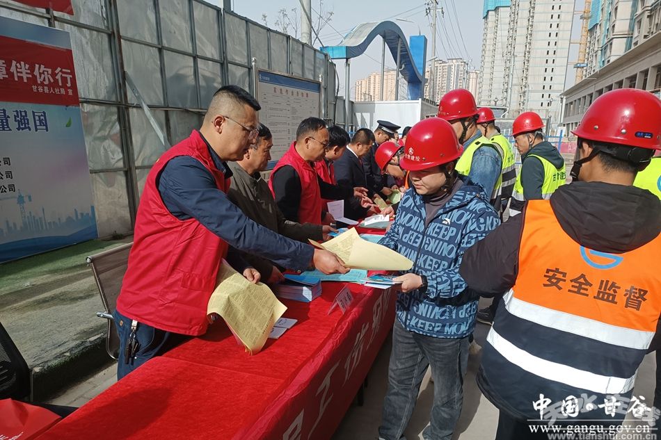 新甘谷訊【通訊員漆代!4月8日,甘谷縣在姚莊渭濱府邸東區(qū)項(xiàng)目工地成功舉辦了以“春風(fēng)送法暖民心服務(wù)保障伴你行”為主題的農(nóng)民工法治宣傳教育日活動。縣人社局、縣法院、縣檢察院、縣公安局、縣司法局、縣住建局、縣工會等單位參加,共同營造了農(nóng)民工法治宣傳活動濃厚氛圍。此次活動旨在深入貫徹黨中央、國務(wù)院關(guān)于加強(qiáng)農(nóng)民工法治宣傳教育的決策部署,增強(qiáng)農(nóng)民工的法律意識,提高其依法務(wù)工、理性維權(quán)的能力,為構(gòu)建和諧穩(wěn)定的勞動關(guān)系和助推鄉(xiāng)村振興貢獻(xiàn)積極力量。