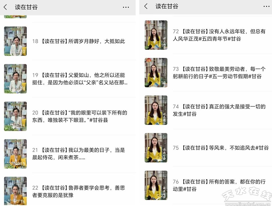 《讀在甘谷》在新甘谷客戶端和甘谷融媒抖音號、視頻號、快手號開播至今,憑借溫暖治愈的聲音呈現(xiàn)、真摯飽滿的情感表達(dá)、豐富多元的內(nèi)容選題,讓觀眾在沉浸式閱讀中,不僅感受到甘谷悠久的歷史厚度、濃郁的文化溫度,更領(lǐng)略到這座城市在新時代浪潮中的蓬勃活力。該欄目已成為連接甘谷本土與外界、溝通傳統(tǒng)與當(dāng)下的重要文化紐帶,有效提升了甘谷文化的傳播力、影響力與美譽度。