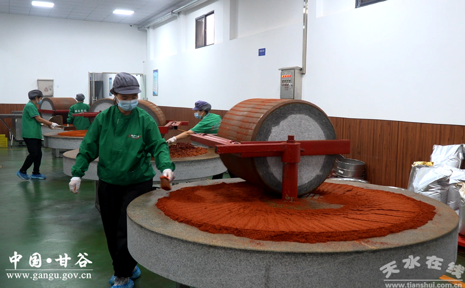 在甘谷縣的一家辣椒加工廠,椒香混合著機(jī)器的運(yùn)轉(zhuǎn)聲撲面而來,新鮮采摘的辣椒在這里經(jīng)過分揀、清洗、烘干等一道道工序,再根據(jù)產(chǎn)品需求,或送入傳統(tǒng)石碾研磨成面,或通過自動(dòng)化設(shè)備切割成段、成絲,最終變身成為各類深受市場歡迎的辣椒制品。
