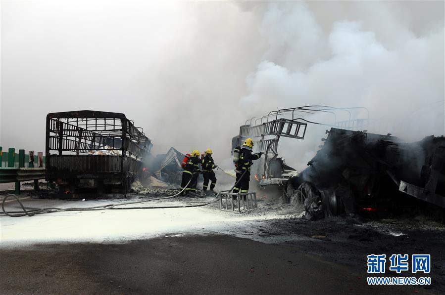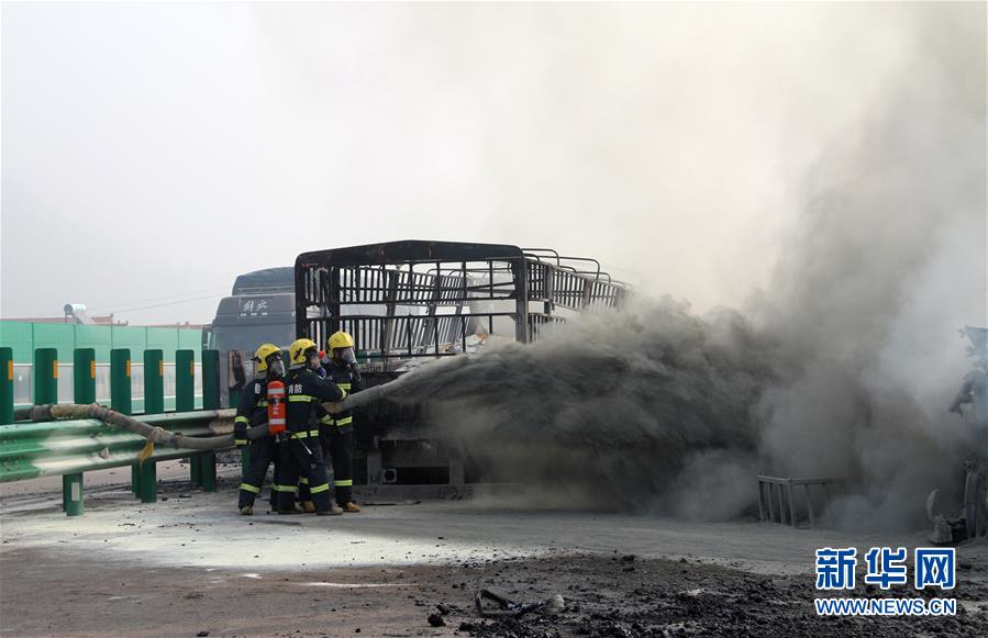 4月21日,在十天高速天水秦州服務(wù)區(qū)附近路段,天水公安消防支隊(duì)消防隊(duì)員在事故現(xiàn)場(chǎng)進(jìn)行處置。新華社發(fā)