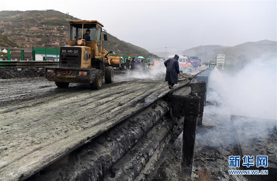 這是在十天高速天水秦州服務(wù)區(qū)附近路段拍攝的事故處置現(xiàn)場(chǎng)(4月21日攝)。新華社記者范培珅攝