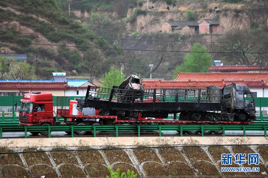 4月21日,在十天高速天水秦州服務(wù)區(qū)附近路段,一輛事故車輛被運(yùn)走。新華社記者范培珅攝 |
