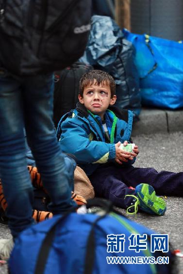 9月6日,一名男孩在德國(guó)慕尼黑火車站外的難民集合區(qū)等候乘坐大巴前往難民臨時(shí)安置點(diǎn)。 新華社記者 羅歡歡 攝