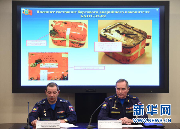12月21日,在俄羅斯首都莫斯科,俄航天事故調(diào)查委員會(huì)代表尼古拉·普里馬科(左)與俄武裝力量航空飛行安全局副局長(zhǎng)謝爾蓋·巴伊涅托夫在新聞發(fā)布會(huì)上介紹情況。當(dāng)日,俄羅斯國(guó)防部在俄國(guó)際航空委員會(huì)舉行新聞發(fā)布會(huì),稱被土耳其擊落的蘇-24戰(zhàn)機(jī)黑匣子存儲(chǔ)卡芯片受損嚴(yán)重,還不能還原蘇-24戰(zhàn)機(jī)飛行信息。新華社記者戴天放攝