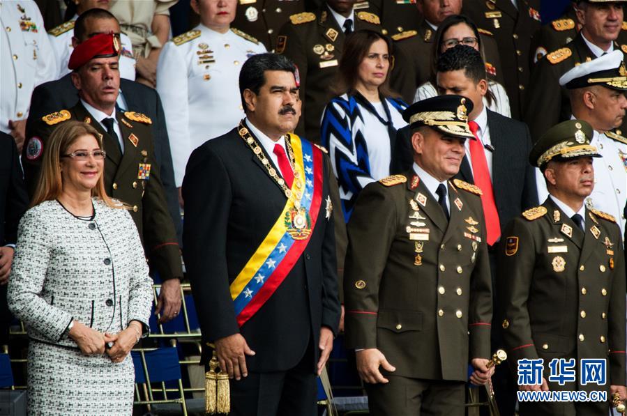 8月4日,委內(nèi)瑞拉總統(tǒng)馬杜羅(前排左二)在加拉加斯出席國民警衛(wèi)隊(duì)成立81周年慶;顒(dòng)。新華社發(fā)