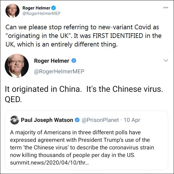 英國(guó)出現(xiàn)變異新冠病毒后,世衛(wèi)組織(WHO)將起源地列為英國(guó),不少主流媒體也引用了相關(guān)言論。但這讓英國(guó)右翼政黨獨(dú)立黨(UKIP)成員,曾擔(dān)任歐洲議會(huì)議員羅杰·赫爾默坐不住了。