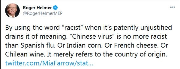 大量網(wǎng)友在他的這條推特下,挖出赫爾默曾經(jīng)發(fā)表的言論。例如早在3月17日,赫爾默就在一條推特中宣稱:“在明顯不合理的情況下,使用‘種族主義’這個(gè)詞會(huì)讓它失去意義!袊(guó)病毒’和‘西班牙流感’一樣不是種族主義。就像印度玉米,或法國(guó)奶酪,或者智利葡萄酒。它僅僅是指原產(chǎn)國(guó)。”